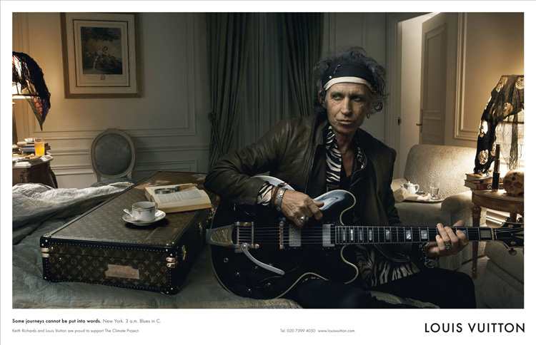 Louis Vuitton got it right with the Keith Richards installment of their ‘Journeys’ campaign. There’s Keef, immortalized in an Annie Liebovitz portrait, playing his black ES-355 in a NYC hotel suite at 3 a.m. The obligatory product placement is there (an LV guitar case on the bed? C’mon). But as a die-hard fan, other details ring true: Skull scarves draped over lamps, antique books and a magnifying glass (he’s a voracious reader), an adult beverage on the nightstand. The world-weary look on his craggy face speaks volumes.